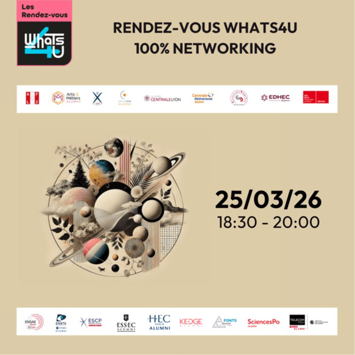 Booster son réseau, au-delà de son école !"Rendez-vous Whats4u" mercredi 25 mars de 18h30 à 20hNetworking 100% en ligne | 100% efficace Je m'inscris gratuitement Le networking, c’est la clé d’une carrière dynamique et évolutive ! Et pourtant, trop souvent, on attend d’en avoir besoin pour le cultiver. Avec Whats4u, profite d’un réseau inter-associations unique, réunissant des alumni issus des meilleures écoles d’ingénieurs et de management. L’occasion parfaite pour :Multiplier tes connexions au-delà de ton cercle habituelÉchanger avec des profils variés, aux expertises et parcours complémentairesDévelopper des opportunités business et préparer tes prochaines étapes professionnelles Pourquoi participer ?Parce qu'un réseau, cela s’entretient tout au long de sa carrière !Pour le format proposé, ultra efficace : des sessions de 20 minutes en petits groupes pour maximiser les rencontres.Pour partager un moment convivial et informel, accessible de partout, faire vivre un collectif d’entraide et de talents. Comment cela se passe-t-il? RDV à 18h30, tu seras accueilli(e) sur Zoom par Franck Jeuffroy et Marine Griot qui te donneront des conseils pour un networking réussi. Tu seras ensuite invité(e) à rejoindre des salles de networking, toujours sur Zoom, lors de sessions de 20mn en petits groupes pour rencontrer un maximum d’alumni, en répartition aléatoire pour favoriser des rencontres inattendues et enrichissantes! Marine Griot­ Marine Griot conseille les cadres dans leurs recherches d'emploi depuis 12 ans. Elle les aide notamment à lever les biais des recruteurs liés à l'âge, à la reconversion ou aux accidents de parcours. Elle anime des masterclasses sur le réseau pour HEC Alumni et a créé Le kit de l’apprenti réseauteur. Découvre son site : https://www.lundisoleil.com/­ Franck Jeuffroy­ Franck Jeuffroy travaille à l’intersection de la stratégie, de la créativité et du développement humain. Son parcours mêle engagement humanitaire, expression artistique, approches somatiques, coaching et coordination de réseaux. Engagé en faveur de l’impact social et environnemental, son travail s’articule autour de la conception d’expériences qui reconnectent les personnes à elles-mêmes, aux autres et à la nature.­ Prépare-toi !Liste tes : Nom / Fonction / Email / Téléphone, pour un partage en un clicPrépare un pitch (2 mn) pour présenter qui tu es, ce qui t'anime et ce que tu recherches Ne laisse pas ton réseau dormir. Inscris-toi gratuitement et rejoins-nous mercredi 25 mars pour un moment unique d’échanges et d’opportunités! Je m'inscris maintenant! Ce networking sera organisé sur Zoom : assure-toi de l'avoir téléchargé. Whats4u est un outil commun à 18 associations de diplômés de grandes écoles prestigieuses, d'ingénieurs et de management.